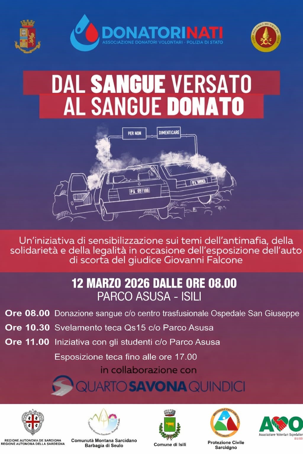 Il 12 marzo 2026 al Parco Asusa di Isili si terrà l’iniziativa “Dal sangue versato al sangue donato”, una giornata dedicata alla memoria del giudice Giovanni Falcone, alla promozione della legalità e alla sensibilizzazione alla donazione del sangue.